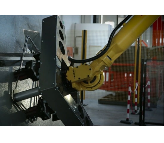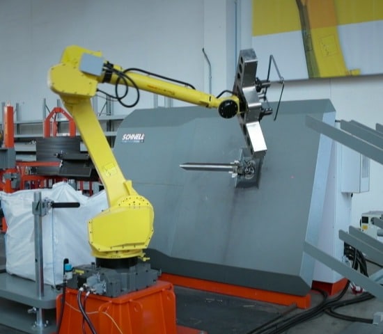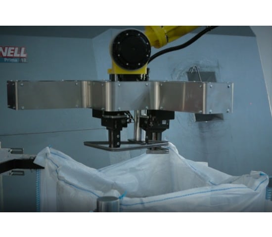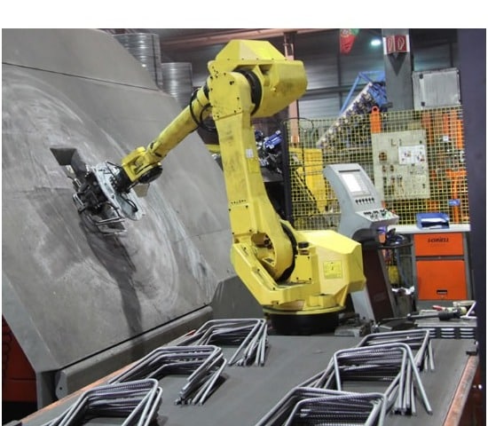 Automatische robot die rechte staven, beugels met variabele vorm en grootte rechtstreeks uit de machine kan halen en deze in vooraf gedefinieerde zones in een afgebakend werkgebied kan leggen en verpakken.